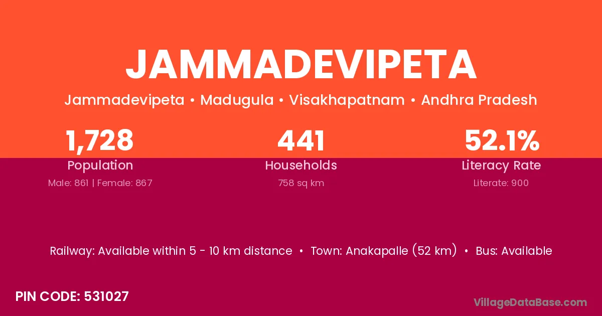 Jammadevipeta village has a total population of 213 people, of which 111 are males and 102 are females.