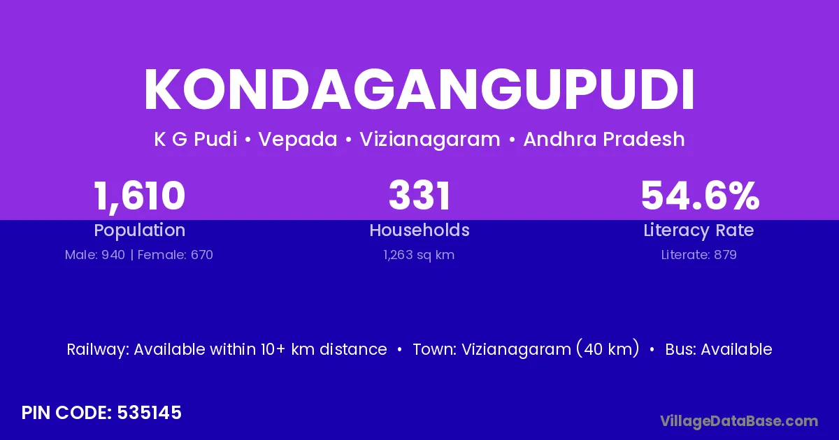 Vizianagaram (40 km) is the nearest town to Kondagangupudi village for major economic activities and is located approximately 40 km away.