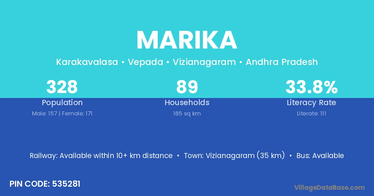 Vizianagaram (35 km) is the nearest town to Marika village for major economic activities and is located approximately 35 km away.