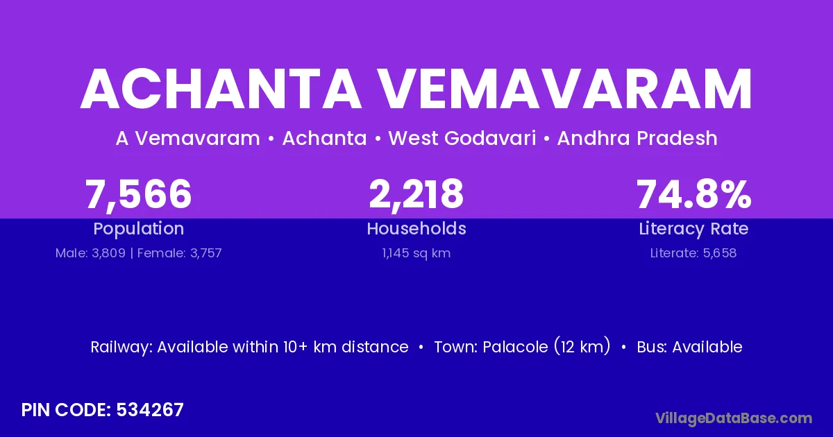 Palacole (12 km) is the nearest town to Achanta Vemavaram village for major economic activities and is located approximately 12 km away.