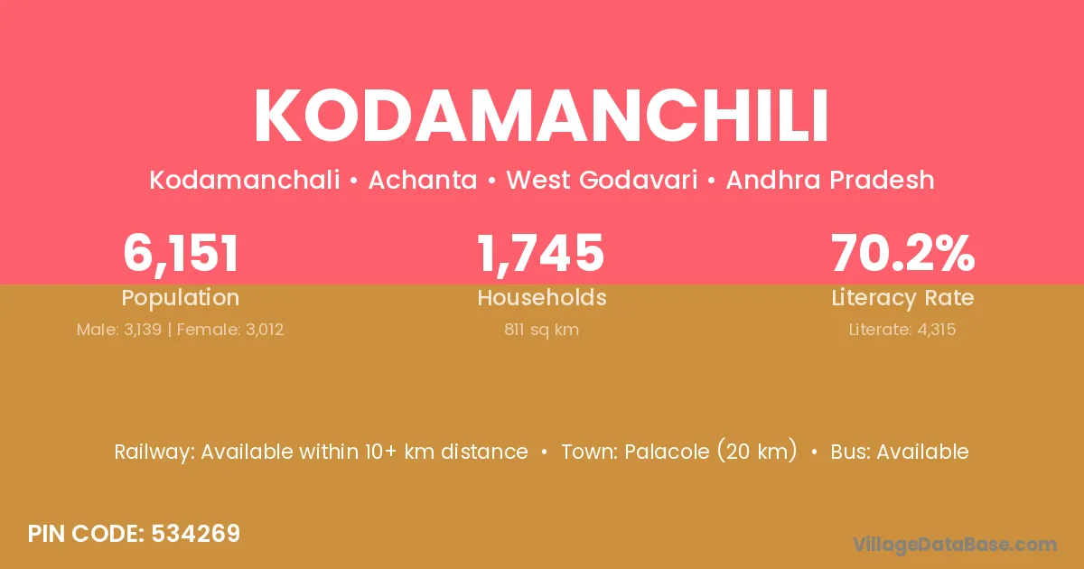Palacole (20 km) is the nearest town to Kodamanchili village for major economic activities and is located approximately 20 km away.