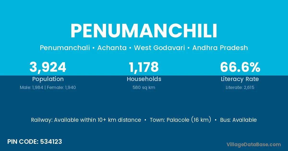 Palacole (16 km) is the nearest town to Penumanchili village for major economic activities and is located approximately 16 km away.