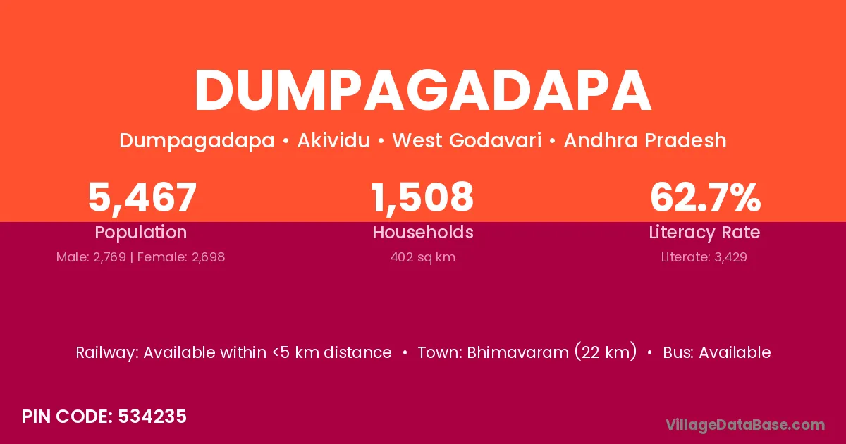 Bhimavaram (22 km) is the nearest town to Dumpagadapa village for major economic activities and is located approximately 22 km away.