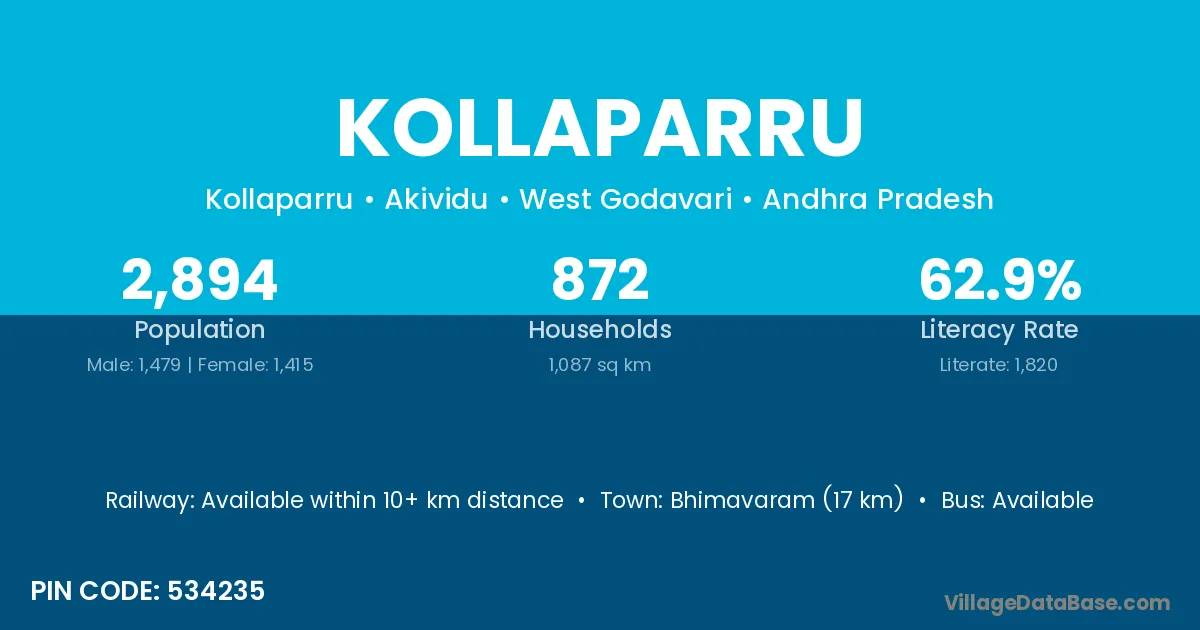 Bhimavaram (17 km) is the nearest town to Kollaparru village for major economic activities and is located approximately 17 km away.