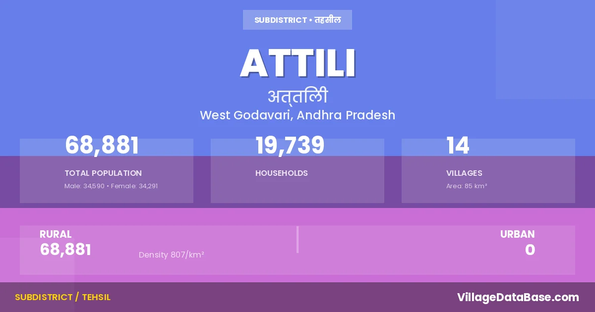 According to the 2011 census The total area of Attili Mandal is 85 km², with a population of 68881 people. The population density is 807 inhabitants per square kilometre, and there are approximately 19739 houses in the sub district.