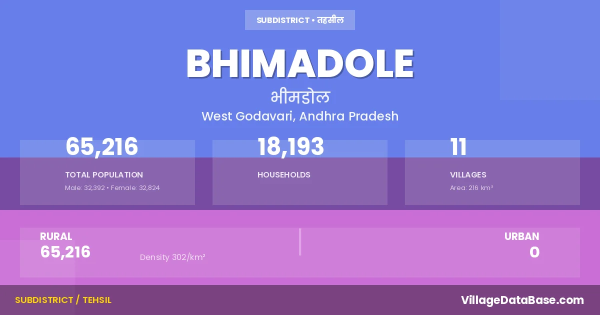 According to the 2011 census The total area of Bhimadole Mandal is 216 km², with a population of 65216 people. The population density is 302 inhabitants per square kilometre, and there are approximately 18193 houses in the sub district.