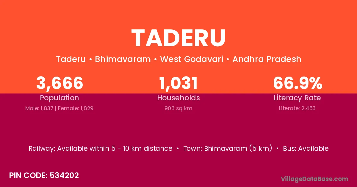 Bhimavaram (5 km) is the nearest town to Taderu village for major economic activities and is located approximately 5 km away.