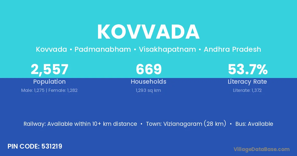 Tadepallegudem (55 km) is the nearest town to Kovvada village for major economic activities and is located approximately 55 km away.