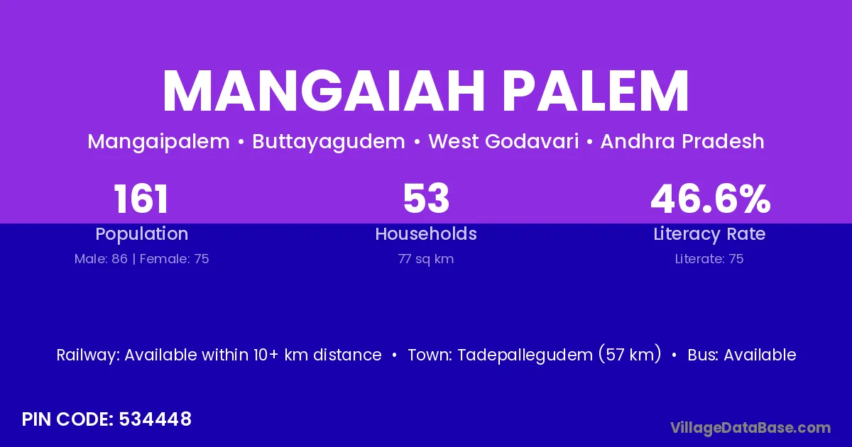 Tadepallegudem (57 km) is the nearest town to Mangaiah Palem village for major economic activities and is located approximately 57 km away.