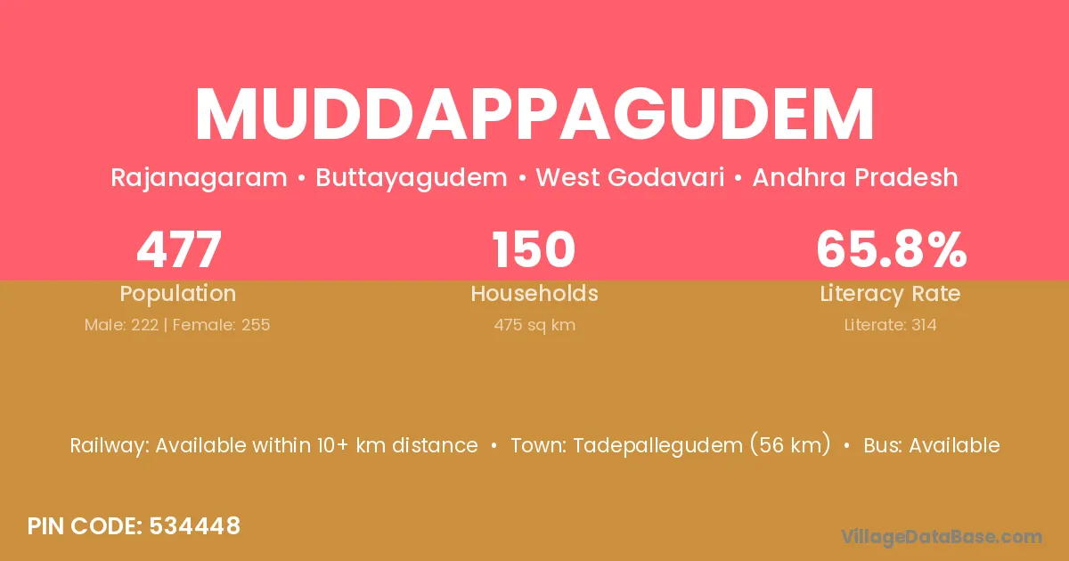 Muddappagudem village has a total population of 477 people, of which 222 are males and 255 are females.