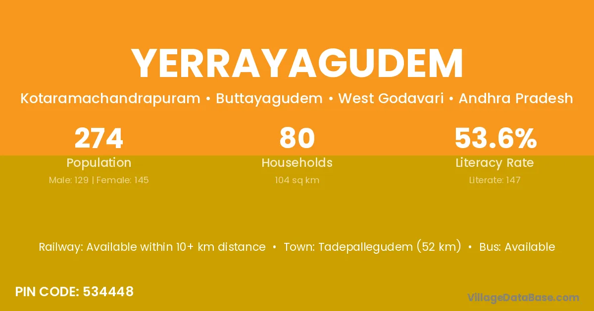 Yerrayagudem village has a total population of 274 people, of which 129 are males and 145 are females.
