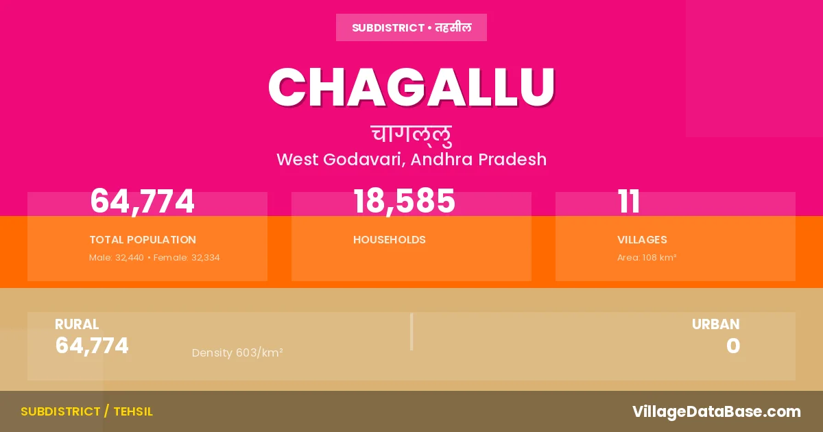 According to the 2011 census The total area of Chagallu Mandal is 108 km², with a population of 64774 people. The population density is 603 inhabitants per square kilometre, and there are approximately 18585 houses in the sub district.