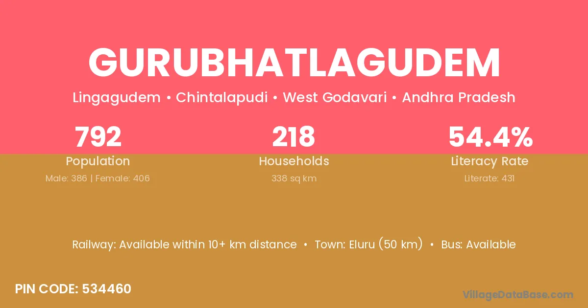 Gurubhatlagudem village has a total population of 792 people, of which 386 are males and 406 are females.