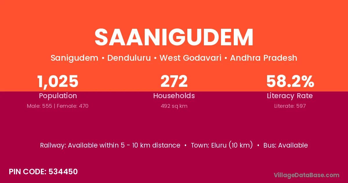 Saanigudem village has a total population of 1,025 people, of which 555 are males and 470 are females.
