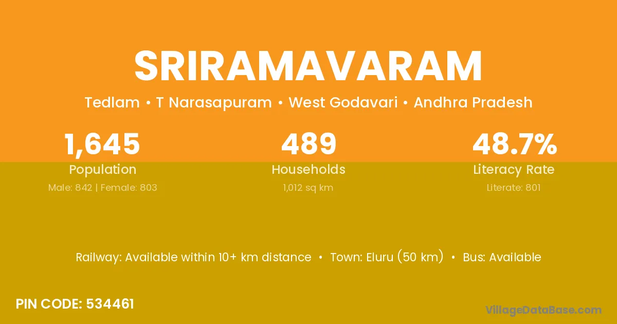 Eluru (16 km) is the nearest town to Sriramavaram village for major economic activities and is located approximately 16 km away.
