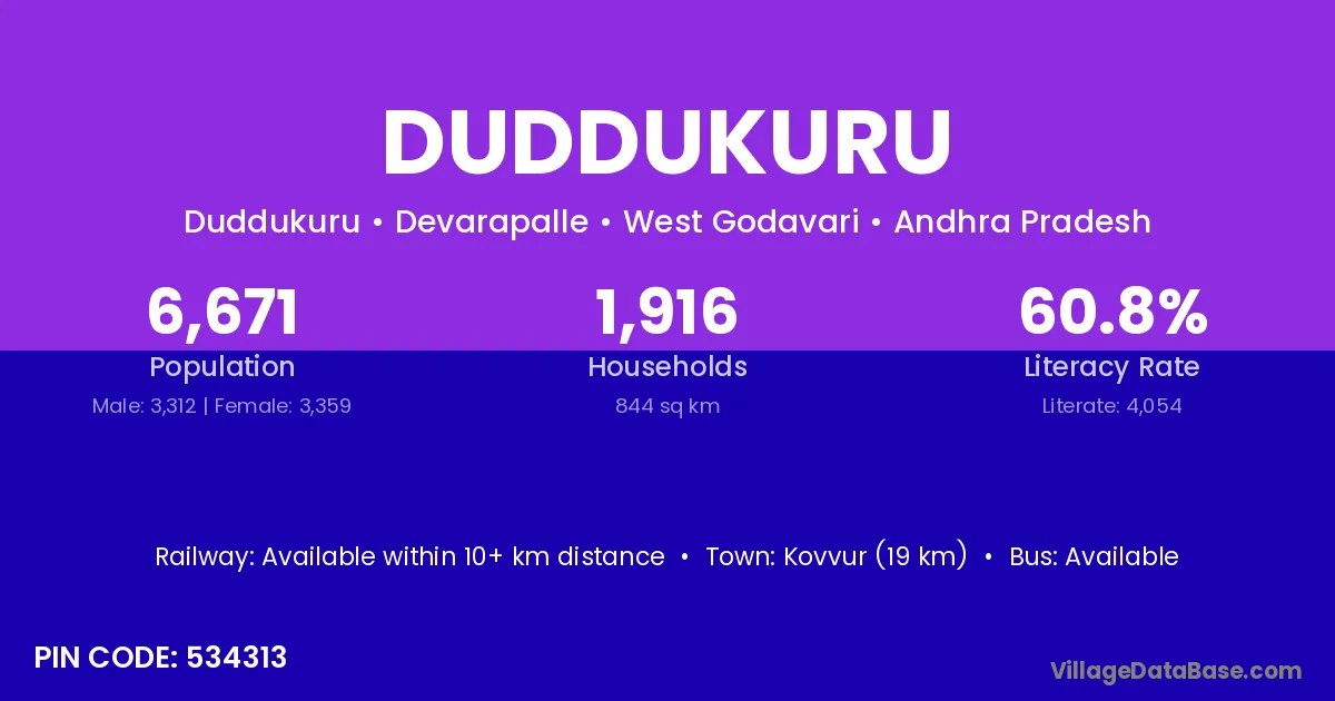 Kovvur (19 km) is the nearest town to Duddukuru village for major economic activities and is located approximately 19 km away.