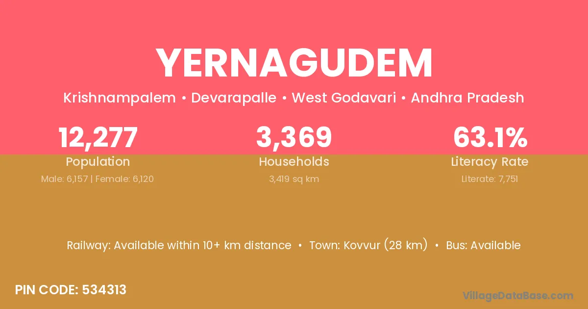 Kovvur (28 km) is the nearest town to Yernagudem village for major economic activities and is located approximately 28 km away.