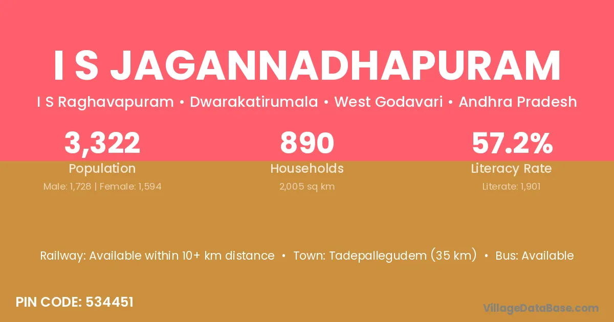 Tadepallegudem (35 km) is the nearest town to I S Jagannadhapuram village for major economic activities and is located approximately 35 km away.