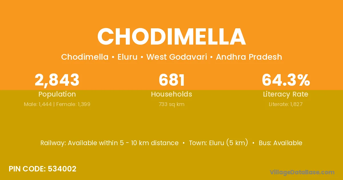 Eluru (5 km) is the nearest town to Chodimella village for major economic activities and is located approximately 5 km away.