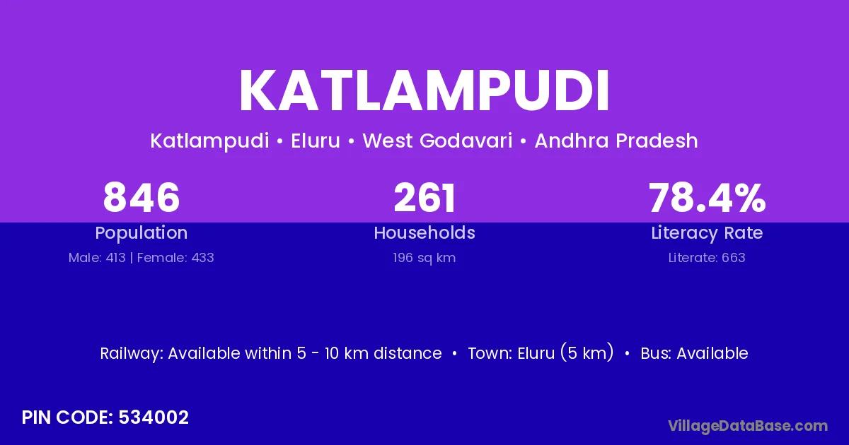 Eluru (5 km) is the nearest town to Katlampudi village for major economic activities and is located approximately 5 km away.
