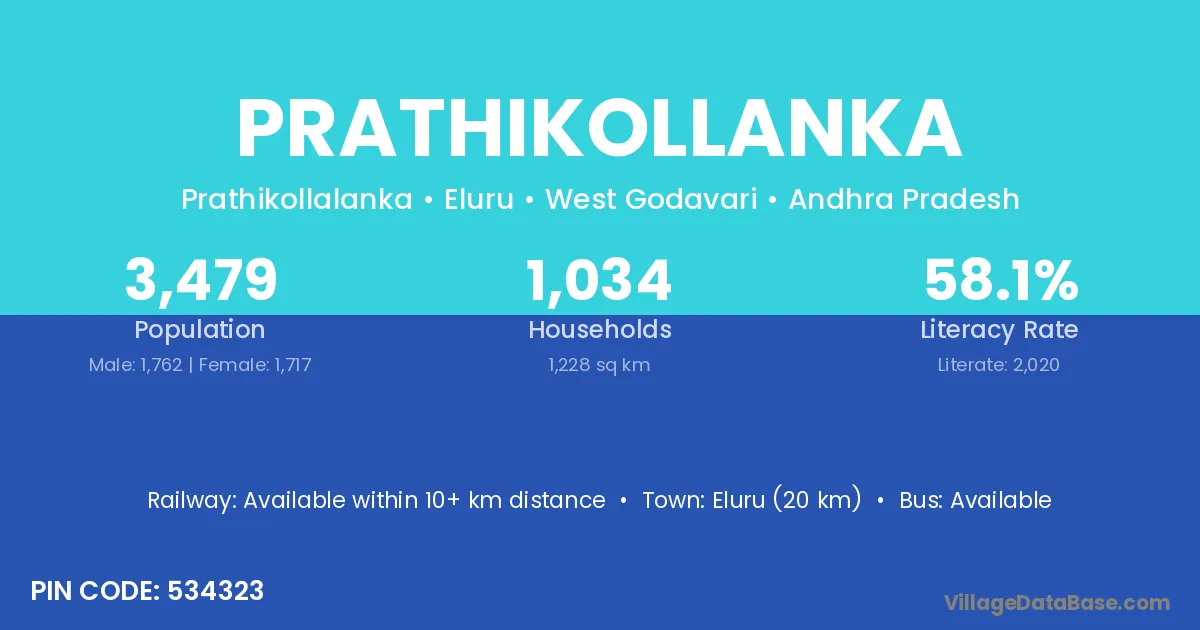 Eluru (20 km) is the nearest town to Prathikollanka village for major economic activities and is located approximately 20 km away.