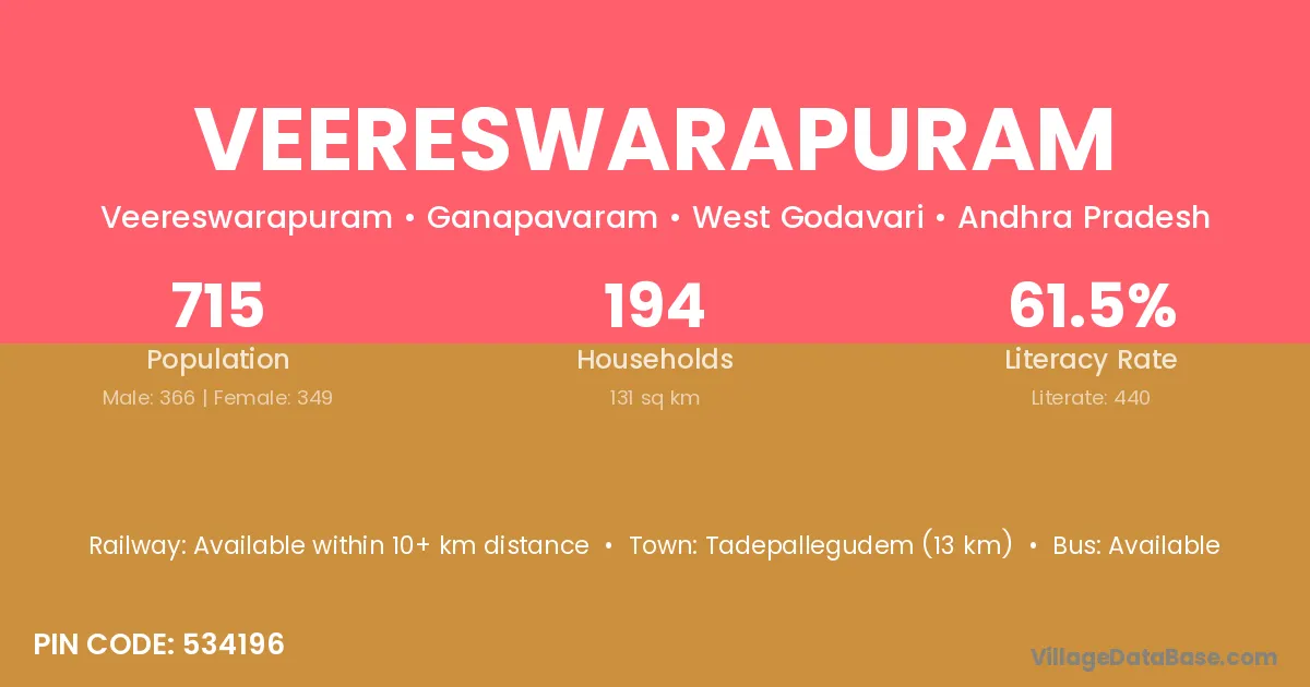 Tadepallegudem (13 km) is the nearest town to Veereswarapuram village for major economic activities and is located approximately 13 km away.
