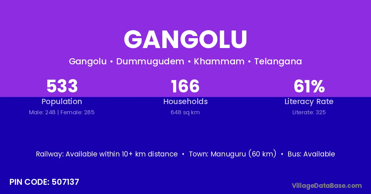 The literacy rate of Gangolu village is 60.86%. Male literacy stands at 62.46% and female literacy at 59.26%.