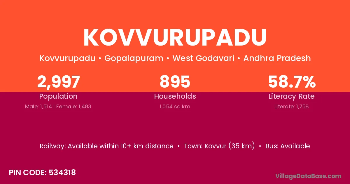 Kovvurupadu village has a total population of 2,997 people, of which 1,514 are males and 1,483 are females.