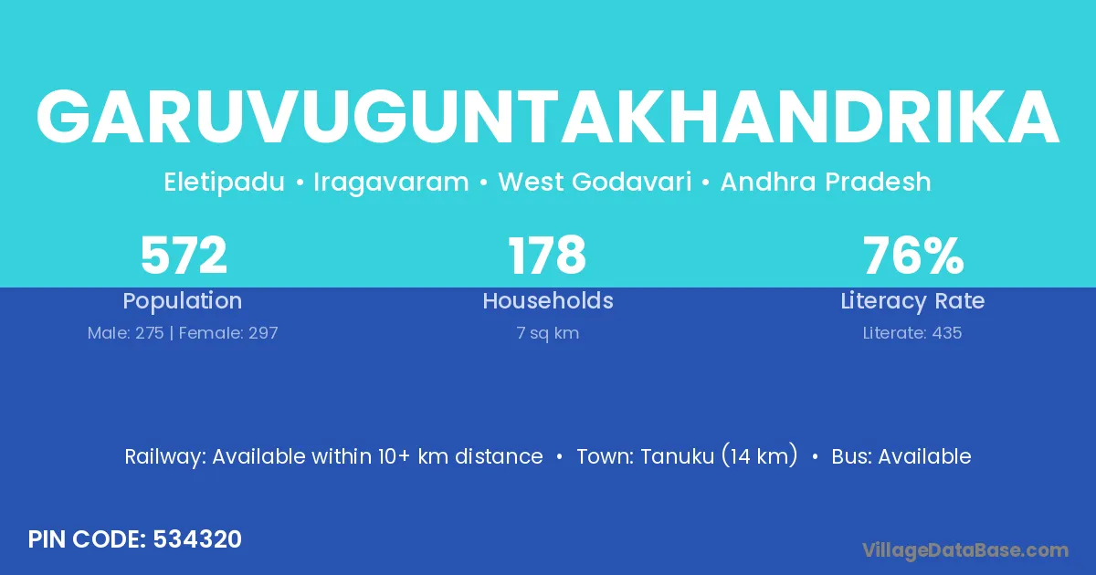 Tanuku (14 km) is the nearest town to Garuvuguntakhandrika village for major economic activities and is located approximately 14 km away.