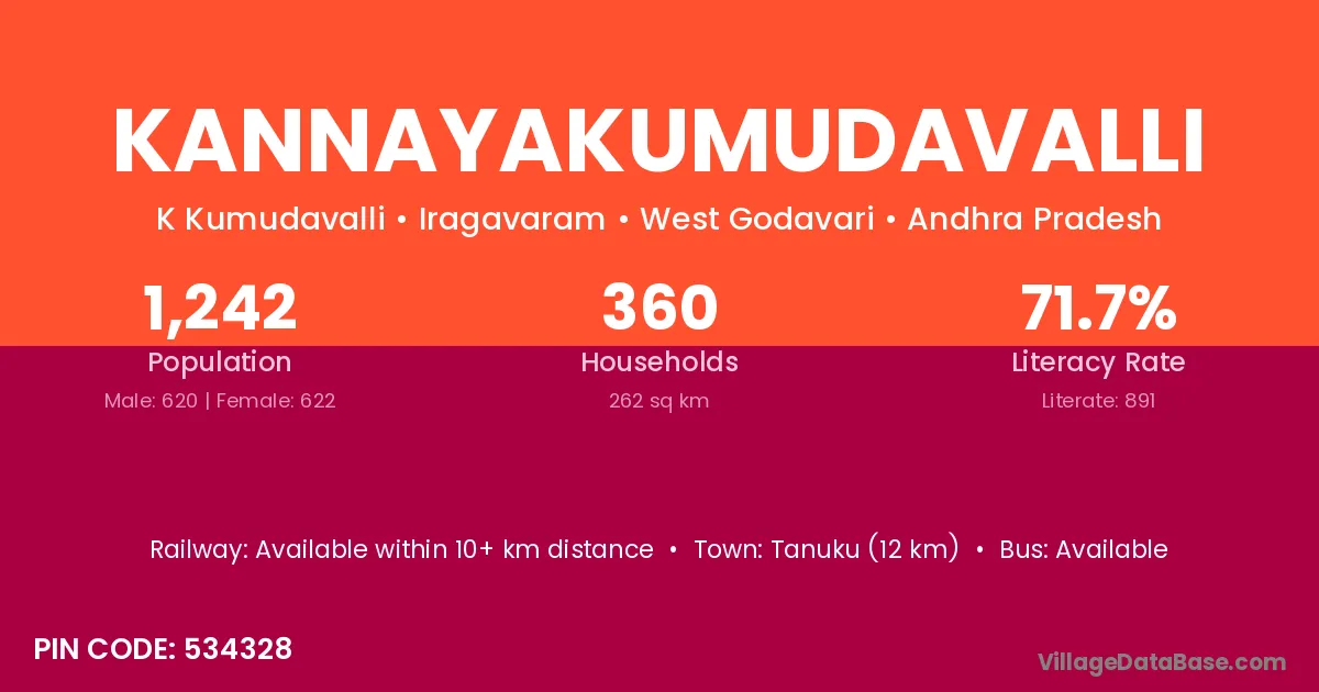 Tanuku (12 km) is the nearest town to Kannayakumudavalli village for major economic activities and is located approximately 12 km away.