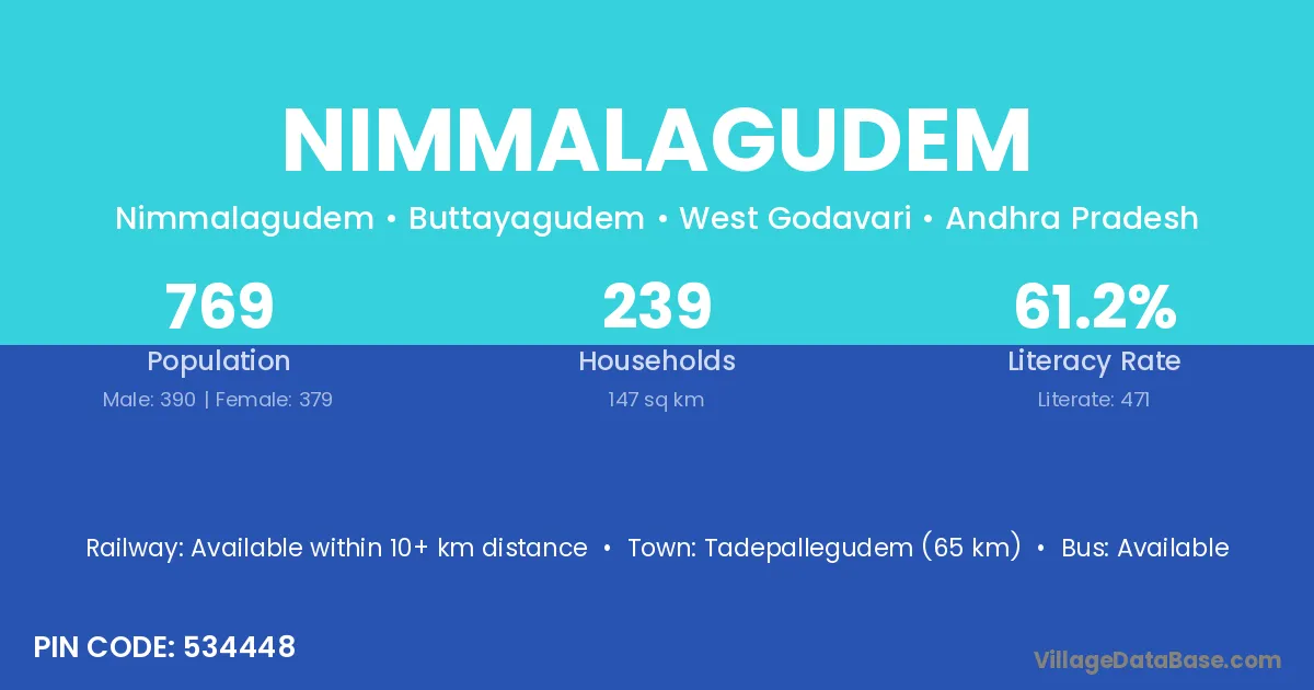 Eluru (58 km) is the nearest town to Nimmalagudem village for major economic activities and is located approximately 58 km away.