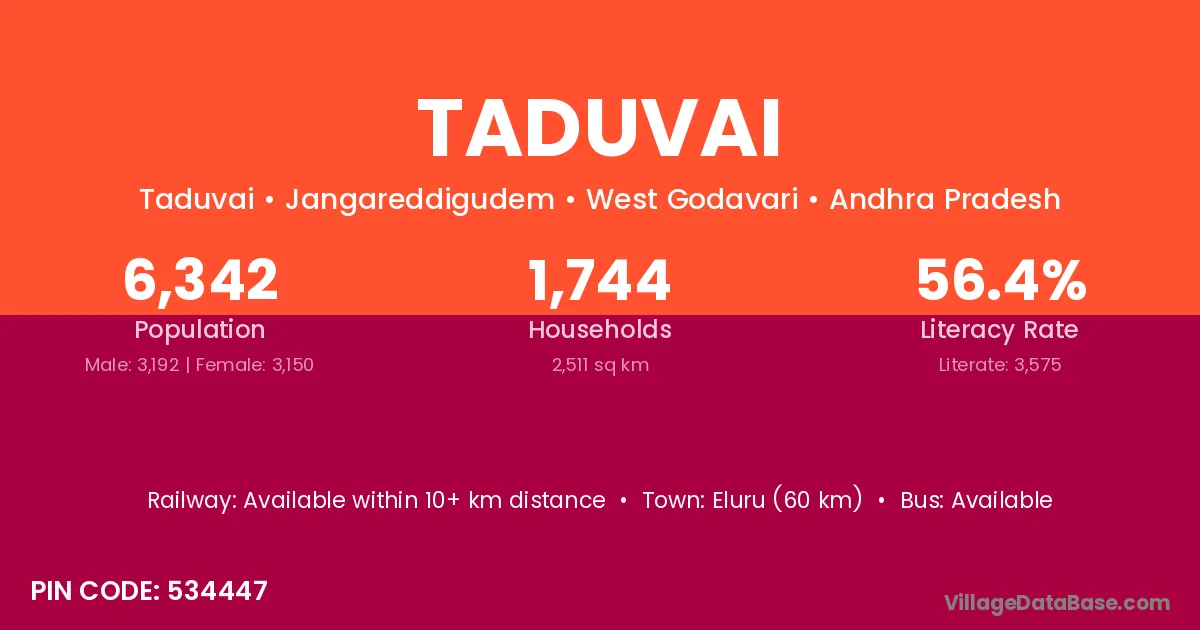 Eluru (60 km) is the nearest town to Taduvai village for major economic activities and is located approximately 60 km away.
