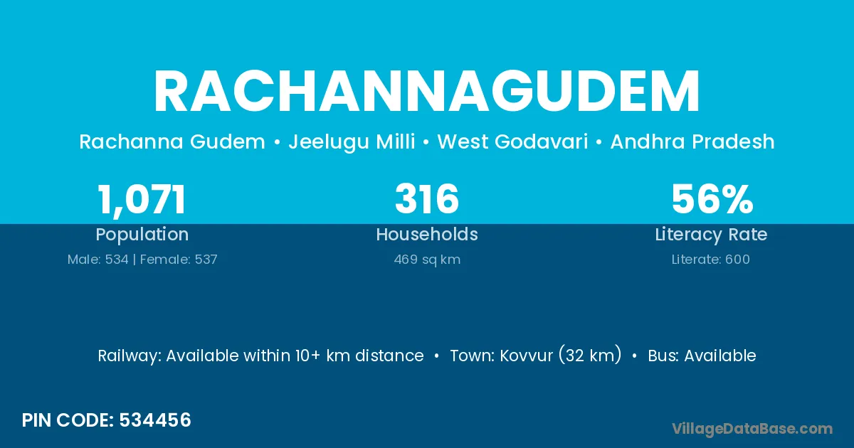 Rachannagudem village has a total population of 1,071 people, of which 534 are males and 537 are females.