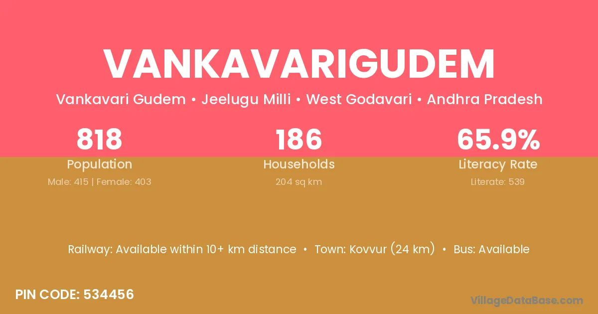 Kovvur (24 km) is the nearest town to Vankavarigudem village for major economic activities and is located approximately 24 km away.