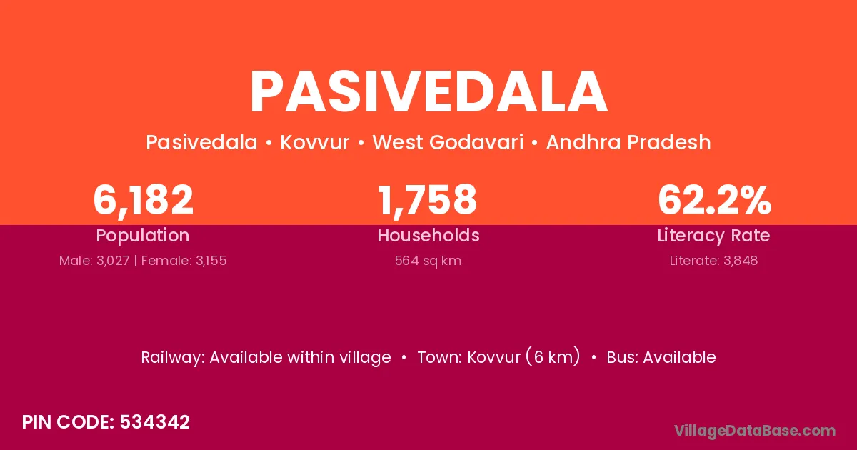 Pasivedala village has a total population of 6,182 people, of which 3,027 are males and 3,155 are females.