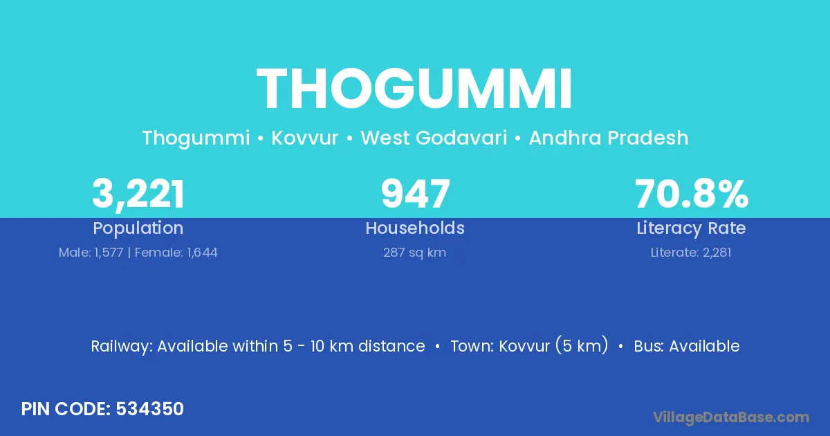 Kovvur (5 km) is the nearest town to Thogummi village for major economic activities and is located approximately 5 km away.