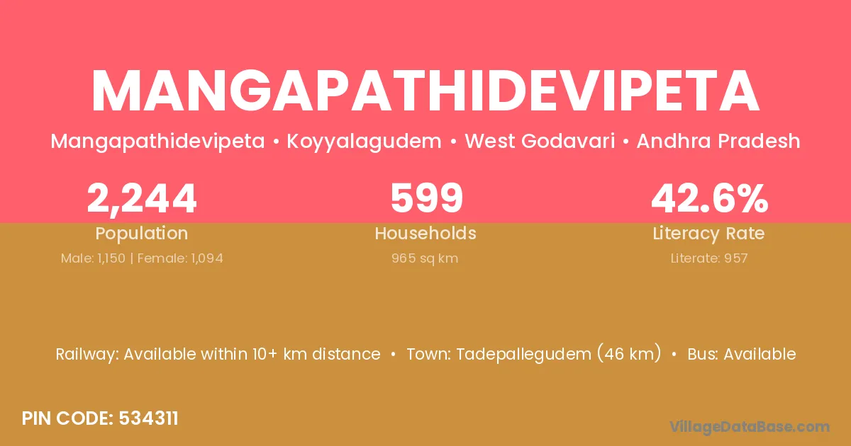 Tadepallegudem (46 km) is the nearest town to Mangapathidevipeta village for major economic activities and is located approximately 46 km away.