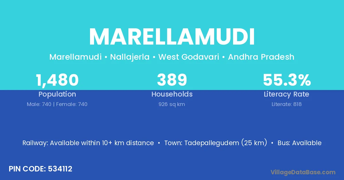 Tadepallegudem (25 km) is the nearest town to Marellamudi village for major economic activities and is located approximately 25 km away.