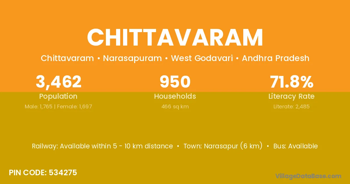 Narasapur (6 km) is the nearest town to Chittavaram village for major economic activities and is located approximately 6 km away.