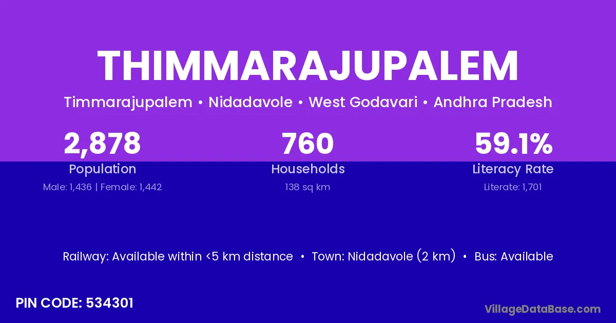 Nidadavole (2 km) is the nearest town to Thimmarajupalem village for major economic activities and is located approximately 2 km away.