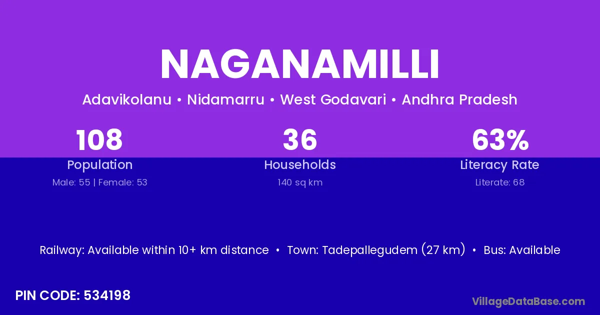 Tadepallegudem (27 km) is the nearest town to Naganamilli village for major economic activities and is located approximately 27 km away.