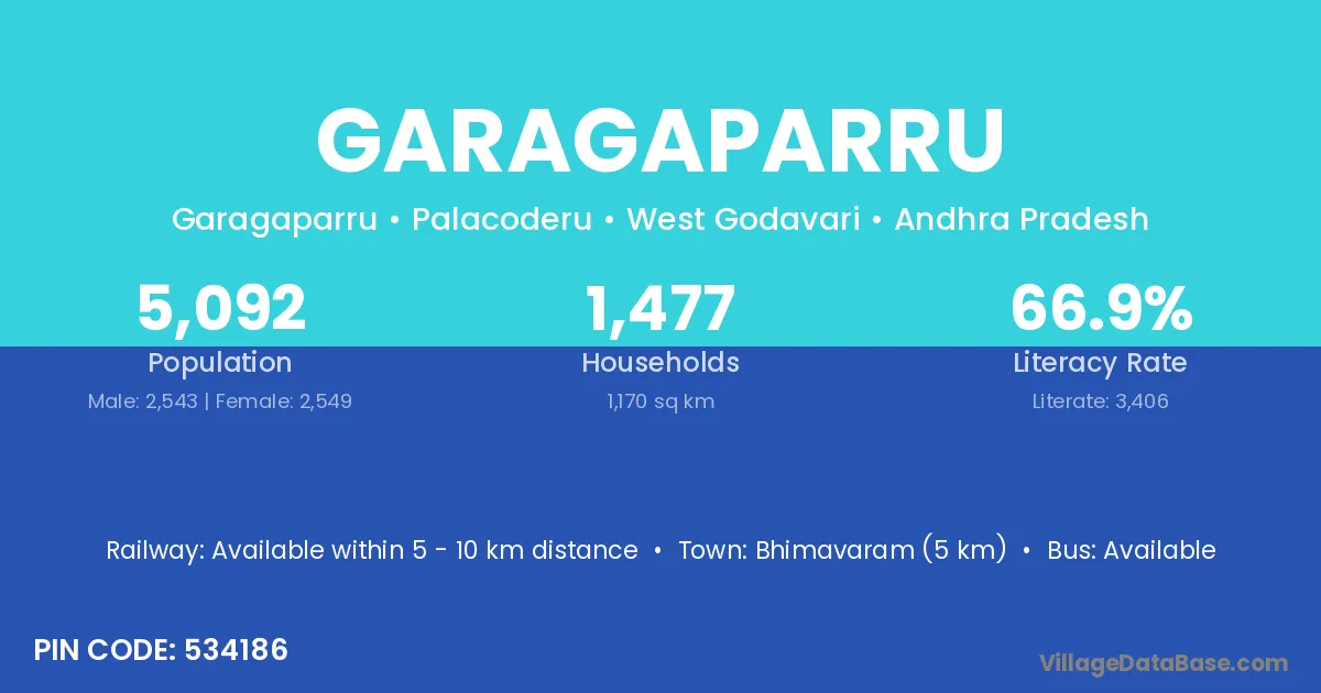 Bhimavaram (5 km) is the nearest town to Garagaparru village for major economic activities and is located approximately 5 km away.