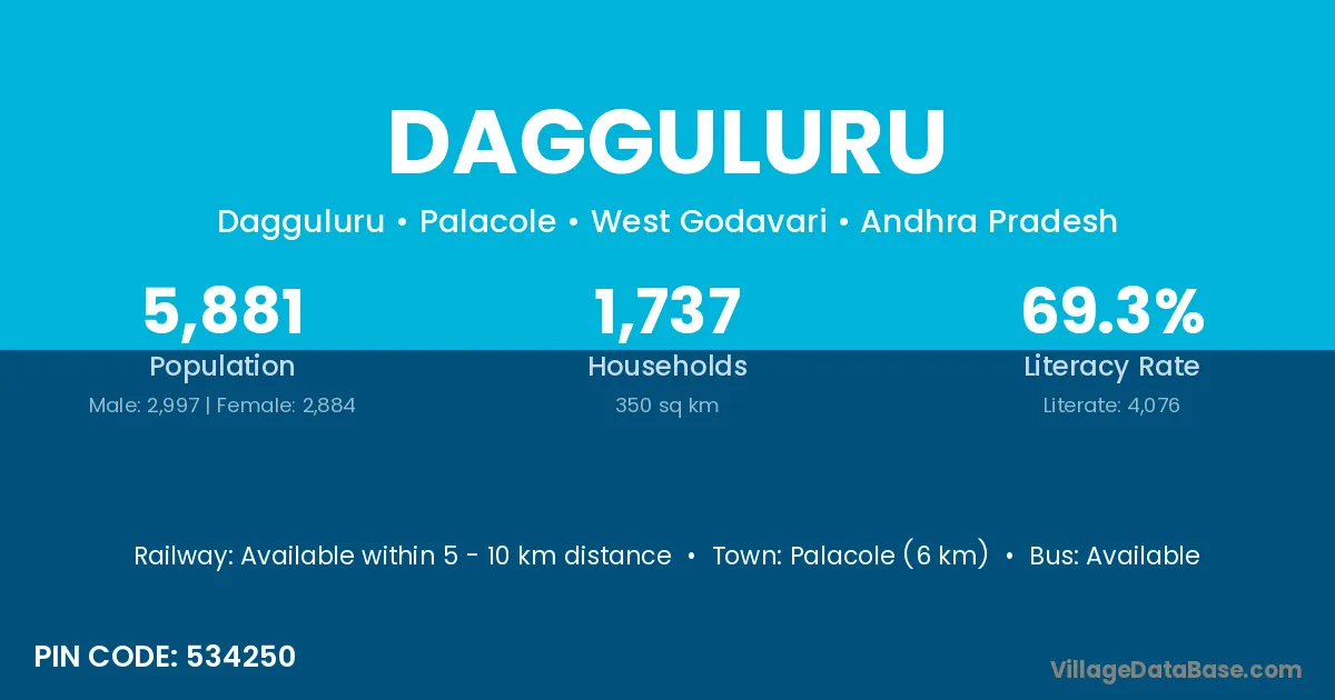 Palacole (6 km) is the nearest town to Dagguluru village for major economic activities and is located approximately 6 km away.