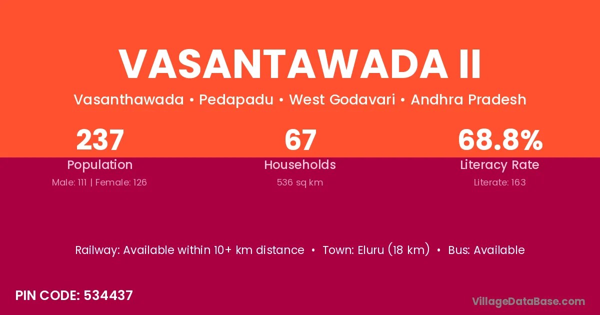 Vasantawada Ii village has a total population of 237 people, of which 111 are males and 126 are females.