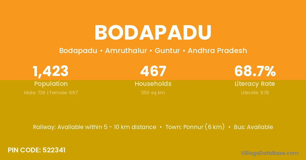 Tadepallegudem (8 km) is the nearest town to Bodapadu village for major economic activities and is located approximately 8 km away.