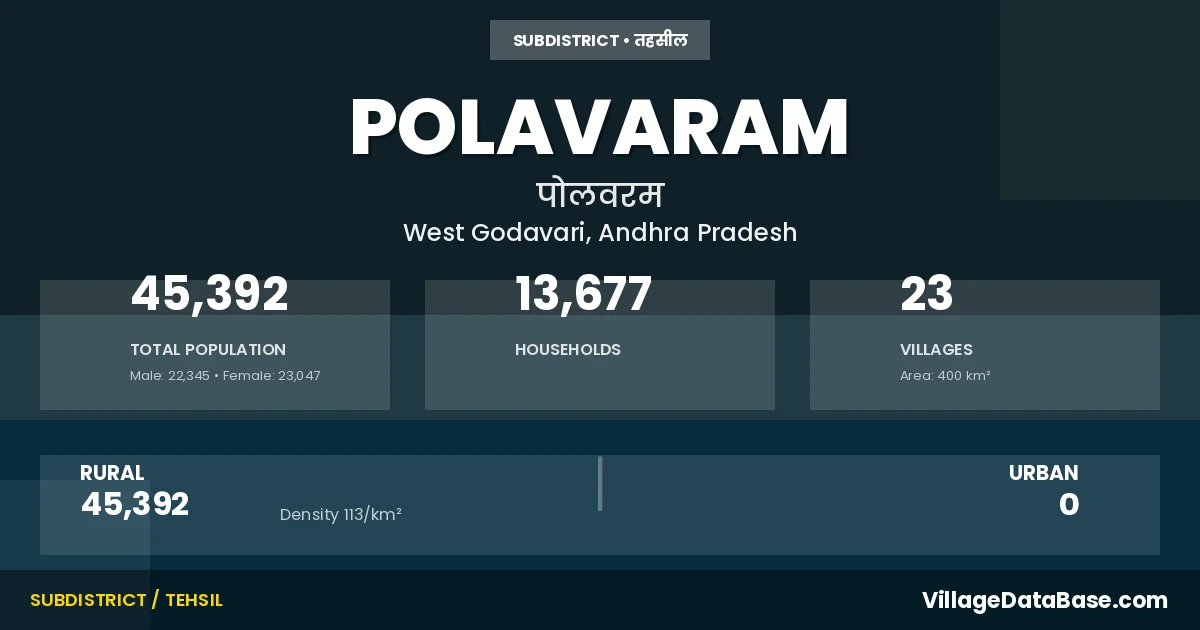 According to the 2011 census The total area of Polavaram Mandal is 400 km², with a population of 45392 people. The population density is 113 inhabitants per square kilometre, and there are approximately 13677 houses in the sub district.