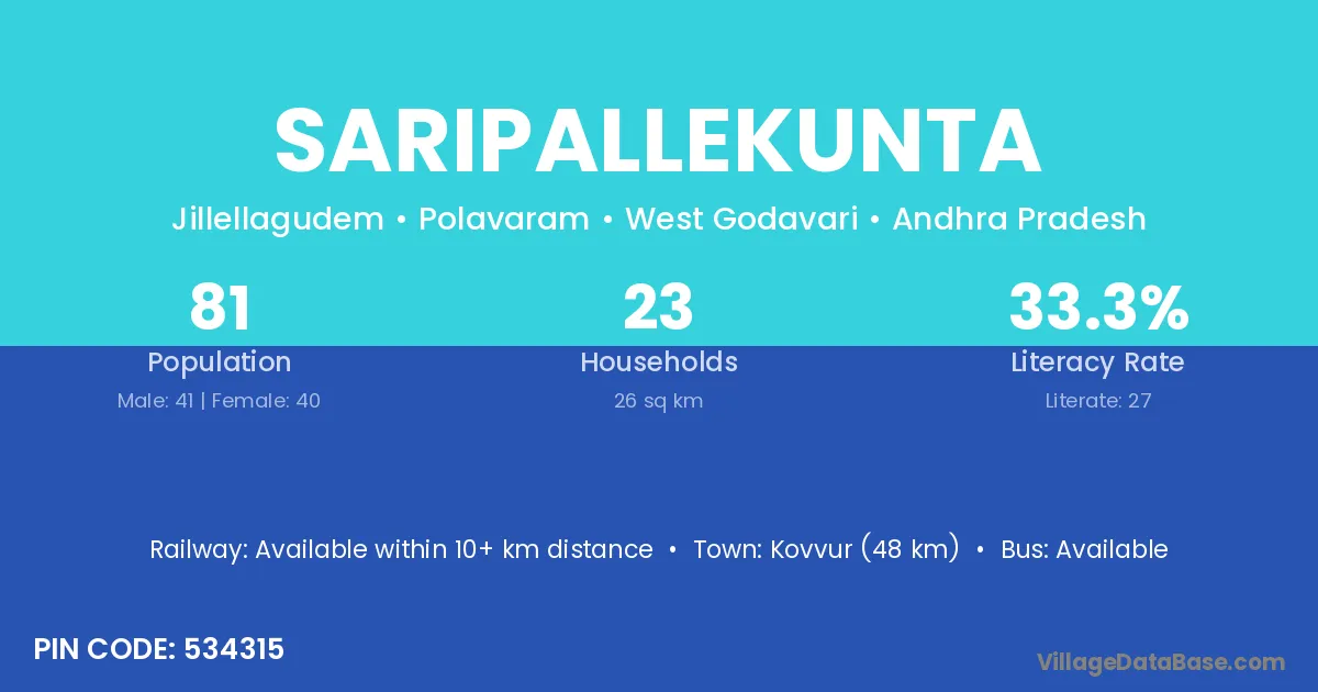 Kovvur (48 km) is the nearest town to Saripallekunta village for major economic activities and is located approximately 48 km away.