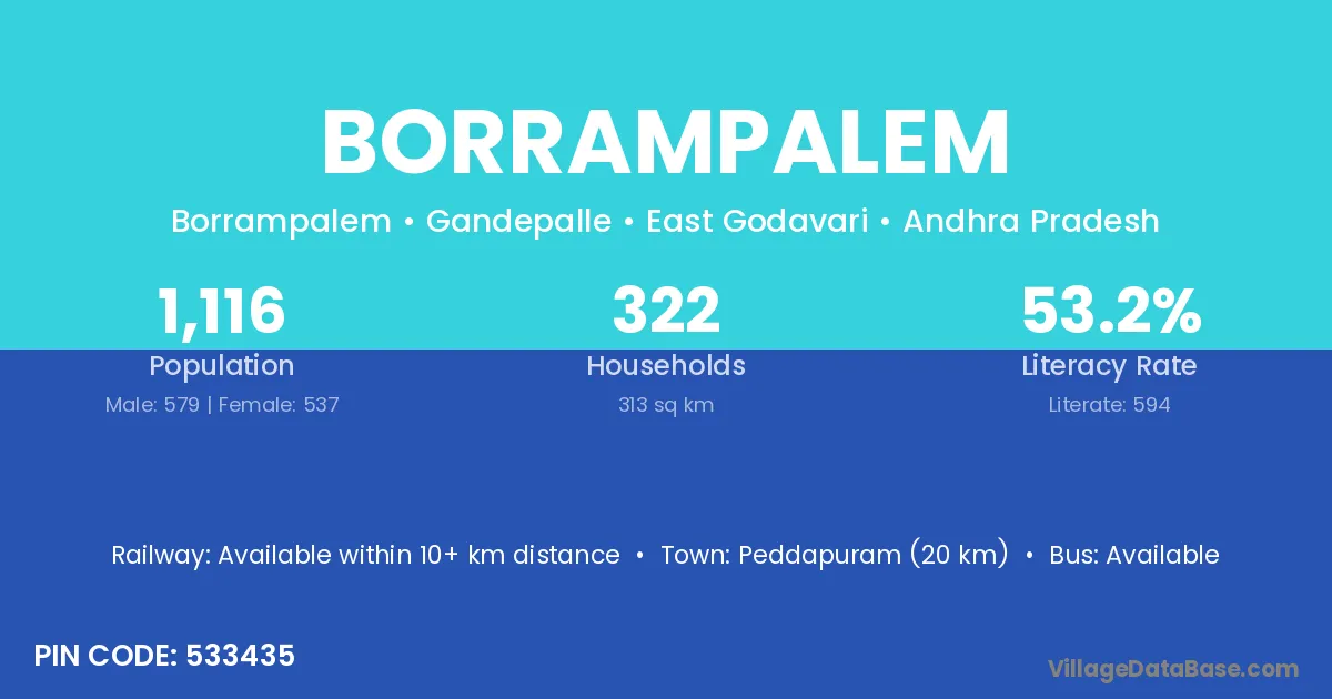 The literacy rate of Borrampalem village is 58.97%. Male literacy stands at 62.73% and female literacy at 55.15%.