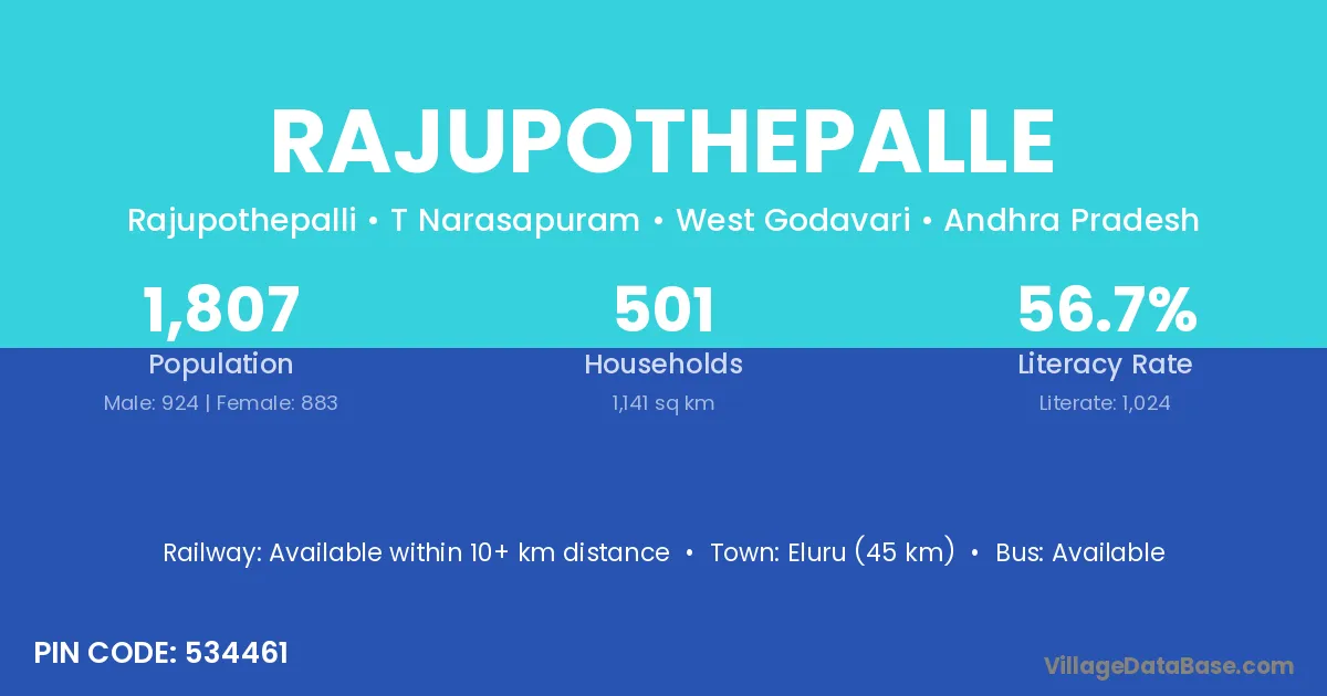 Eluru (45 km) is the nearest town to Rajupothepalle village for major economic activities and is located approximately 45 km away.
