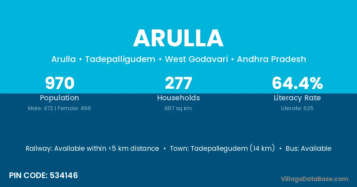 Tadepallegudem (14 km) is the nearest town to Arulla village for major economic activities and is located approximately 14 km away.
